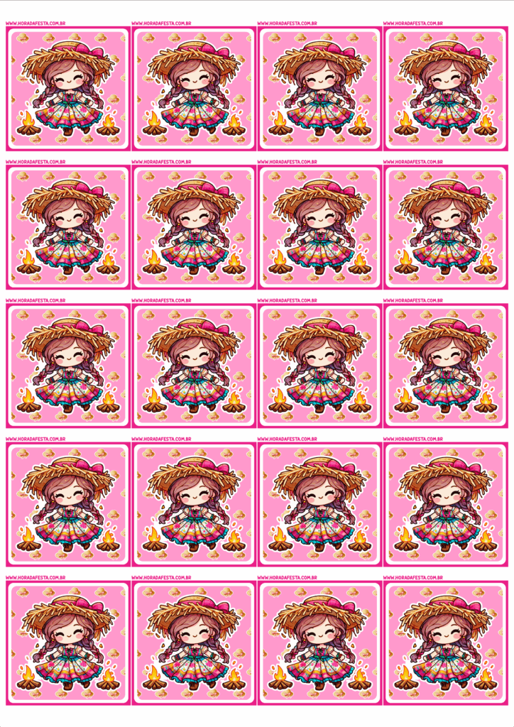 Adesivo redondo para festa junina rosa menina com vestido e chapéu de palha 20 imagens png