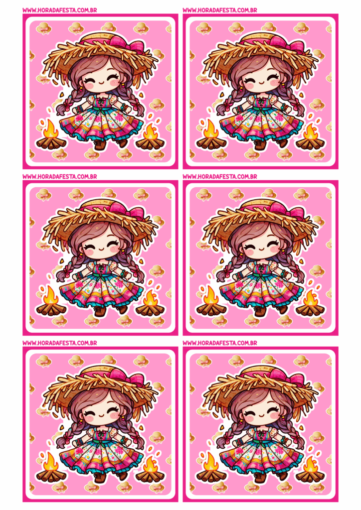 Adesivo redondo para festa junina rosa menina com vestido e chapéu de palha 6 imagens png