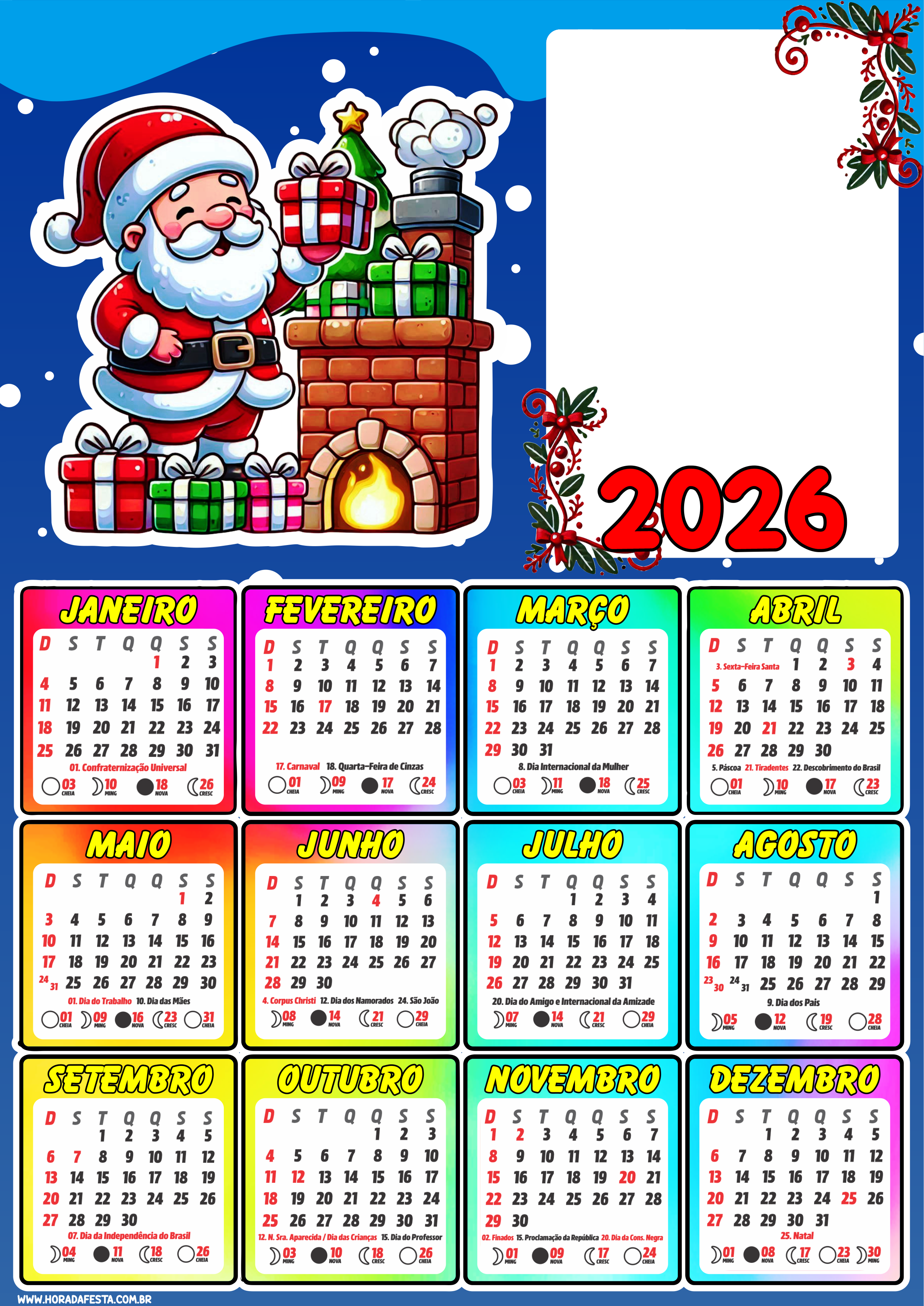 Calendário 2026 para imprimir e personalizar com foto especial de natal artes para artesanato festas de fim de ano papai noel fofinho png